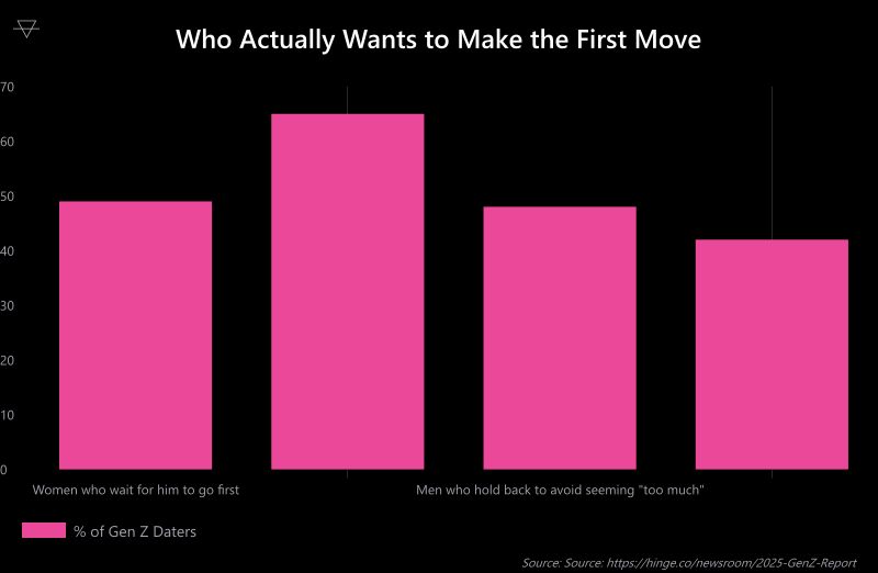 The research backs this up. 65% of Gen Z men say they want meaningful conversations early in dating. But 48% hold back emotionally because they don't want to seem "too much". So they match energy instead of setting it. They play it safe. And safe is forgettable.
