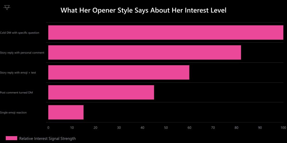 A: It means she noticed something about your profile or content worth engaging with. The level of interest depends on her opener. A story reply with a specific comment signals more interest than a generic emoji reaction. A cold DM to your inbox without prior interaction is the strongest signal because it required the most effort.